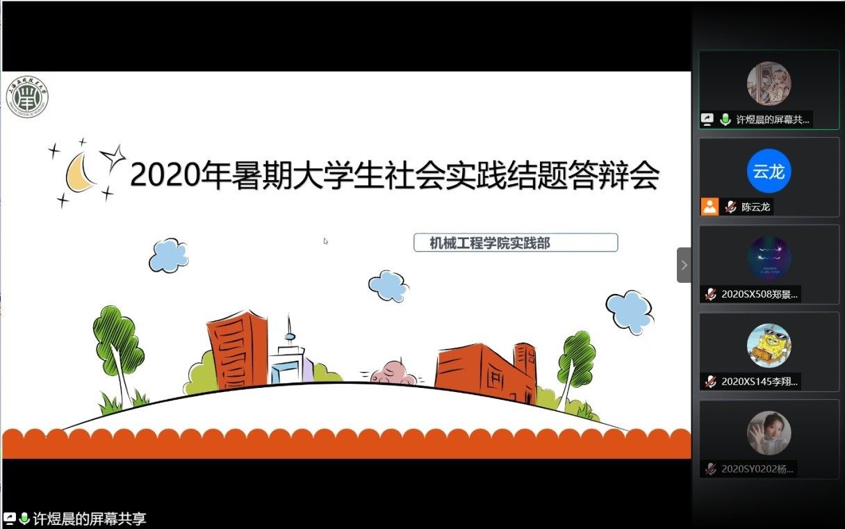 9月13日下午六点,由机械工程学院举行的2020大学生暑期社会实践结题答辩圆满结束。本次结题答辩采取线上模式进行,机械工程学院团委书记王宏老师,机械工程学院分管主席刘林,学生会实践部部长许煜晨以及副部长谌梓康出席了此次会议。