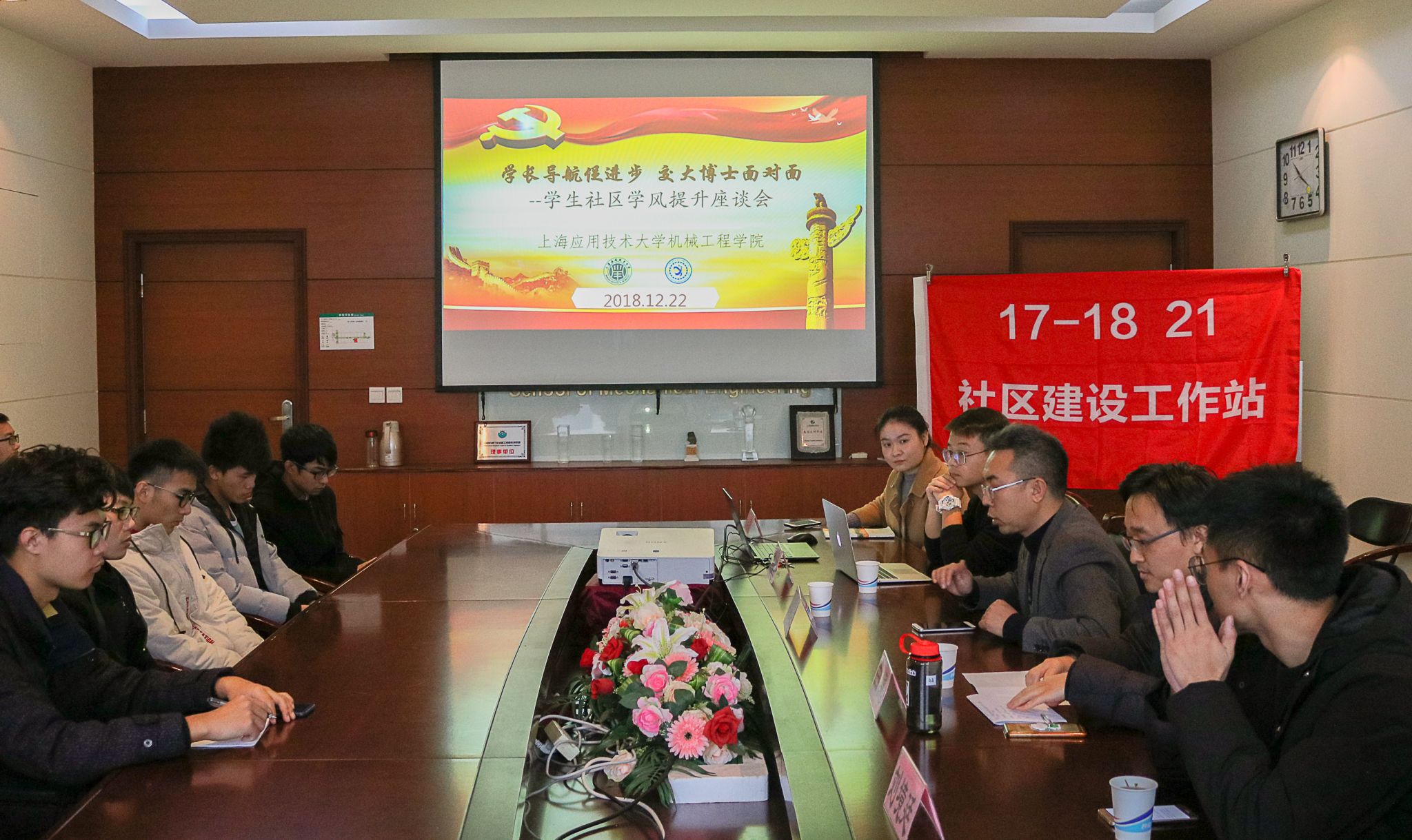 2018年12月22日上午,机械工程学院党总支副书记(主持工作)杨瑞君,作为17、18级18名学生的班导师,组织召开“学风导航促进步,交大博士面对面”学生社区学风提升座谈会,此次座谈会邀请上海交通大学机械工程专业在读博士生杨尚泽、上海大学化学工程在读硕士生刘境廷(原上海应用技术大学工创学院2013级本科生)、民航空管局通信网络公司工程师白晶、辅导员张启君和同学们交流自我管理和自主学习之道。