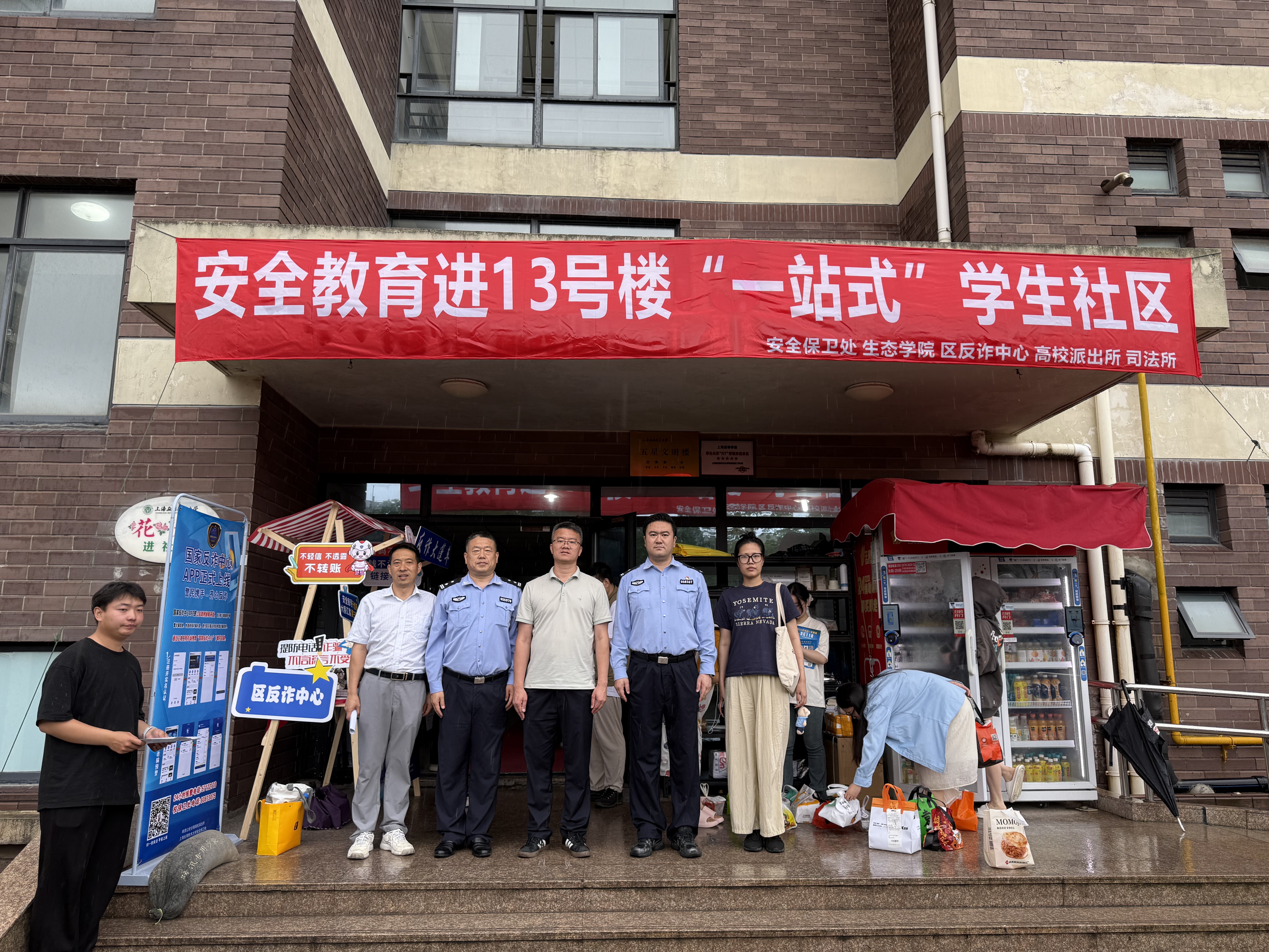 为持续推进在校大学生安全防范教育,提高大学生识诈反诈意识, 6月10日,安全保卫处联合生态学院、奉贤公安分局高校派出所、海湾旅游区平安办及司法所开展安全教育进13#“一站式”学生社区主题教育活动。安全保卫处副处长卫聚金,生态学院副书记、副院长任玉英及相关人员出席。