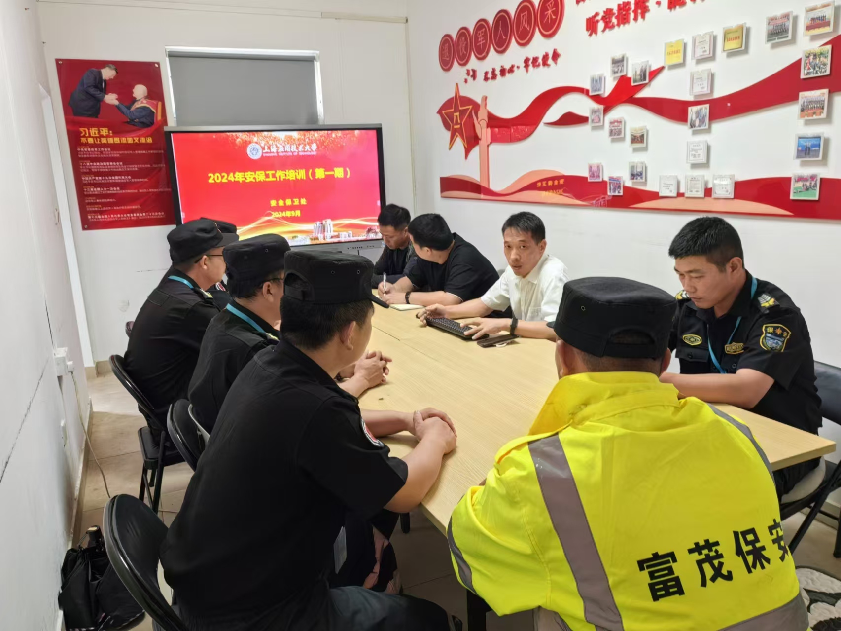 会上,治安科负责人贾书果老师以图文并茂的形式,让安保人员整体熟悉和掌握学校各建筑物的空间分布,详细了解校区的平面结构,对重点的建筑物进行了讲解;同时规范门岗、巡逻岗、监控室等岗位的服务手势,详细讲解了各岗位的服务职责和统一要求,要求做到“思想品格端正、岗容岗姿规范、遵守法纪法规、内务卫生整洁”,业务能力做到“明确职责、熟悉重点、文明用语、纪律严明、快速处置”。结合工作中经常遇到的案例,进行了案例分析和应对措施讲解。