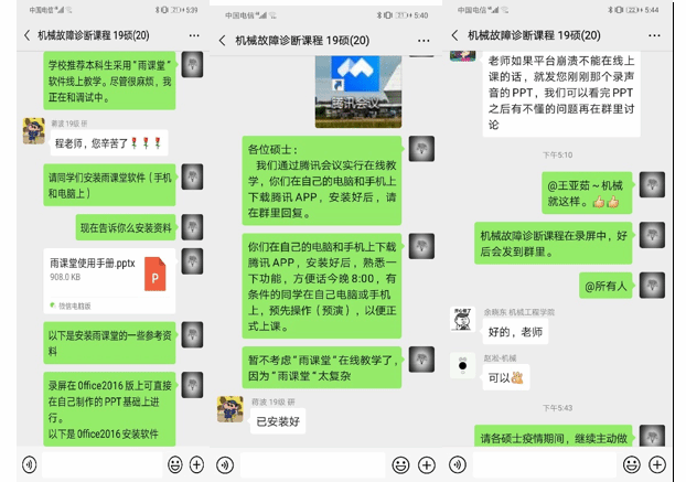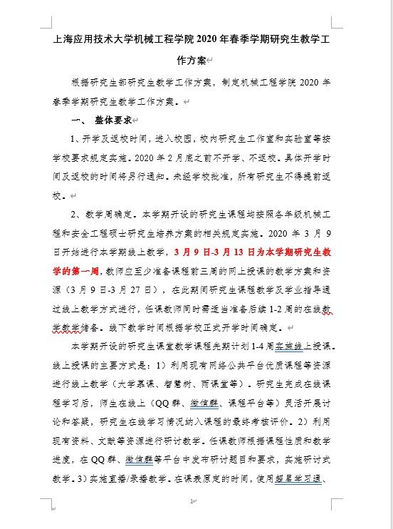 学院提前安排好新学期各项研究生培养、教学工作,制定《上海应用技术大学机械工程学院2020年春季学期研究生教学工作方案》并落实好疫情期间研究生教学工作方案协调、组建覆盖本学期所有研究生课程在线授课的教师工作群,提供在线咨询和保障服务。了解老师授课情况,工作人员时刻保持电话畅通,协调解决线上教学问题,全力保障线上教学工作的顺利开展。