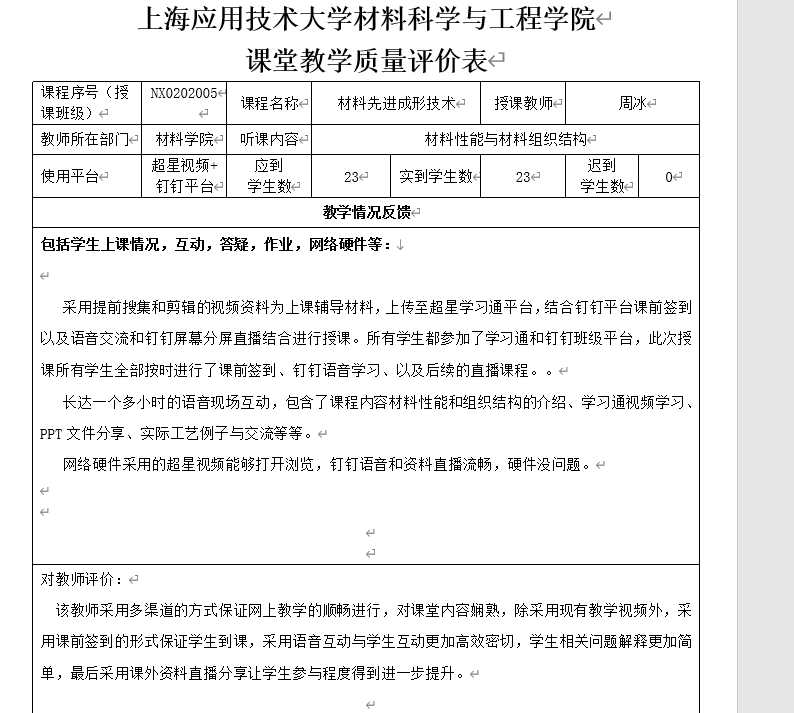 学院成立由机械工程学院院长任组长的疫情防控期间在线教学工作领导小组,副组长张珂老师督导组深入在线课堂,负责落实学院研究生在线教学的整体组织、管理、督导和评价工作。加强在线教学过程及内容管理,鼓励和支持教师充分利用多种在线教学工具开展线上教学与指导、布置学习任务、组织讨论、辅导答疑、考核评价等教学活动,并成立院级在线课程教学督导,对任课教师在线授课情况及时进行监督反馈。督导反馈结果良好(见图)