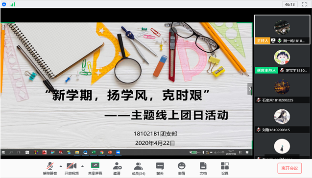 2020年4月,为引导学生高质量完成网络学习任务,营造学院良好学习氛围,提升线上学习质量,进一步养成优良学风,机械工程学院组织各学生团支部,在腾讯会议线上开展“新学期、扬学风、克时艰”系列主题团日活动。