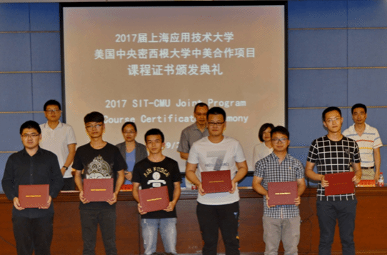 6月8日下午,2017届中美合作班课程结业证书颁发典礼在行政楼117隆重举行。中央密西根大学合作项目负责人,Shaopeng Cheng教授,上海应用技术大学机械工程学院副院长尚慧琳、陈雷,电气与电子工程学院副院长马向华、王乐全出席了典礼。机械及电气专业中美合作班学生及相关老师参加了典礼。典礼由尚慧琳主持。