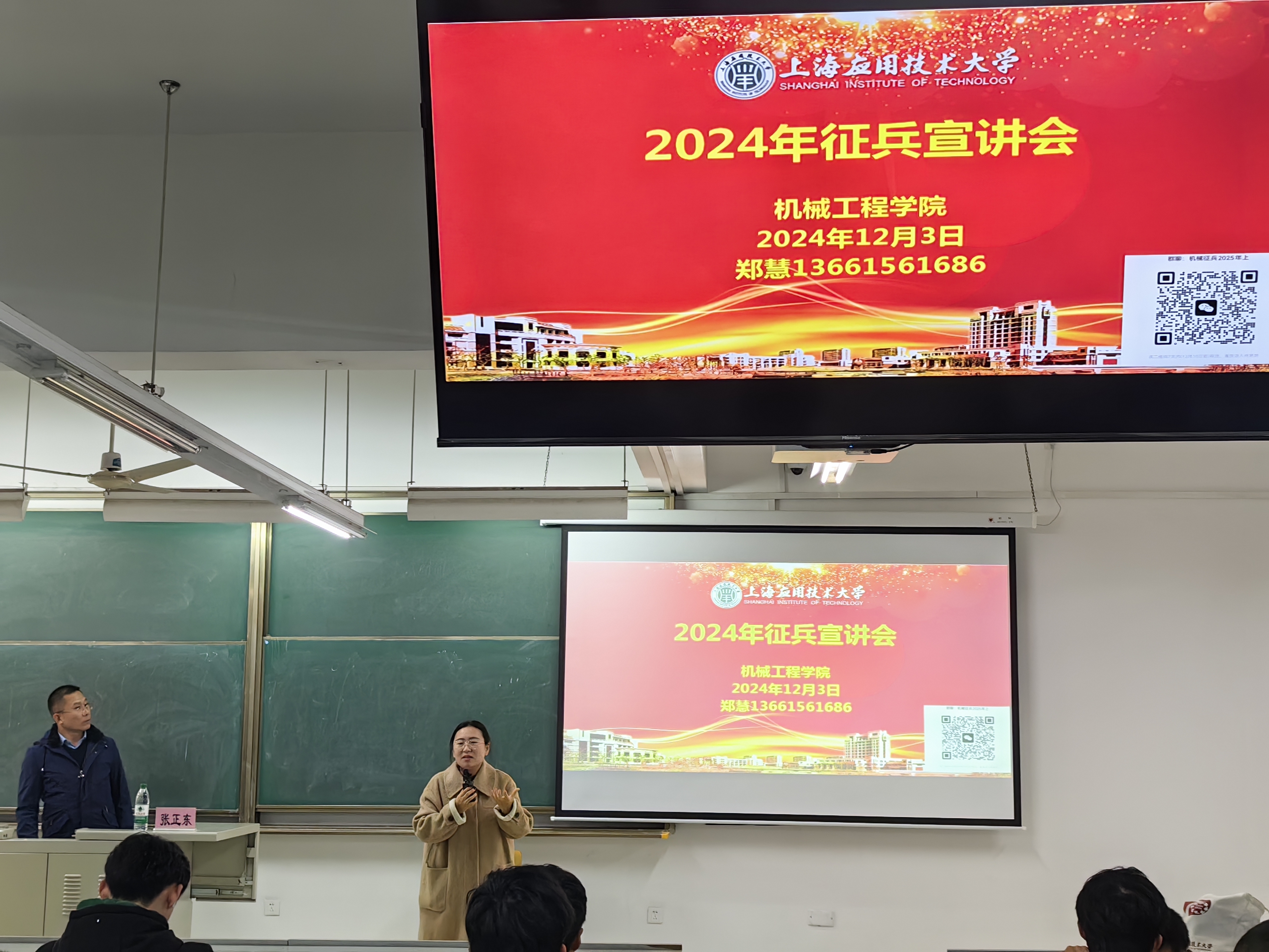 为积极响应国家征兵政策号召,激发我院毕业生为国防事业贡献力量的热情,智能技术学部机械工程学院于12月3日在奉贤校区一教A105开展毕业生征兵宣讲会。本次宣讲会由机械工程学院辅导员郑慧老师主持,特邀上海应用技术大学党委学生工作部、人民武装部张正东老师及退役大学生士兵代表宣讲,220余名机械毕业生参会。