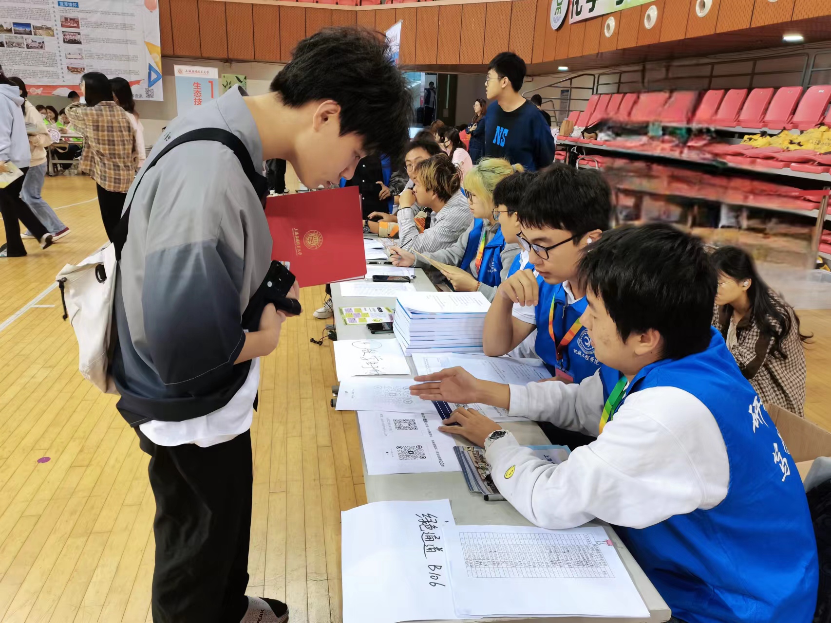 奉贤校区体育馆迎新大厅内人声鼎沸,报到、注册、提交档案、答疑解惑;机械工程学院的工作师生和志愿者们忙碌有序地为我院新生办理入学手续。