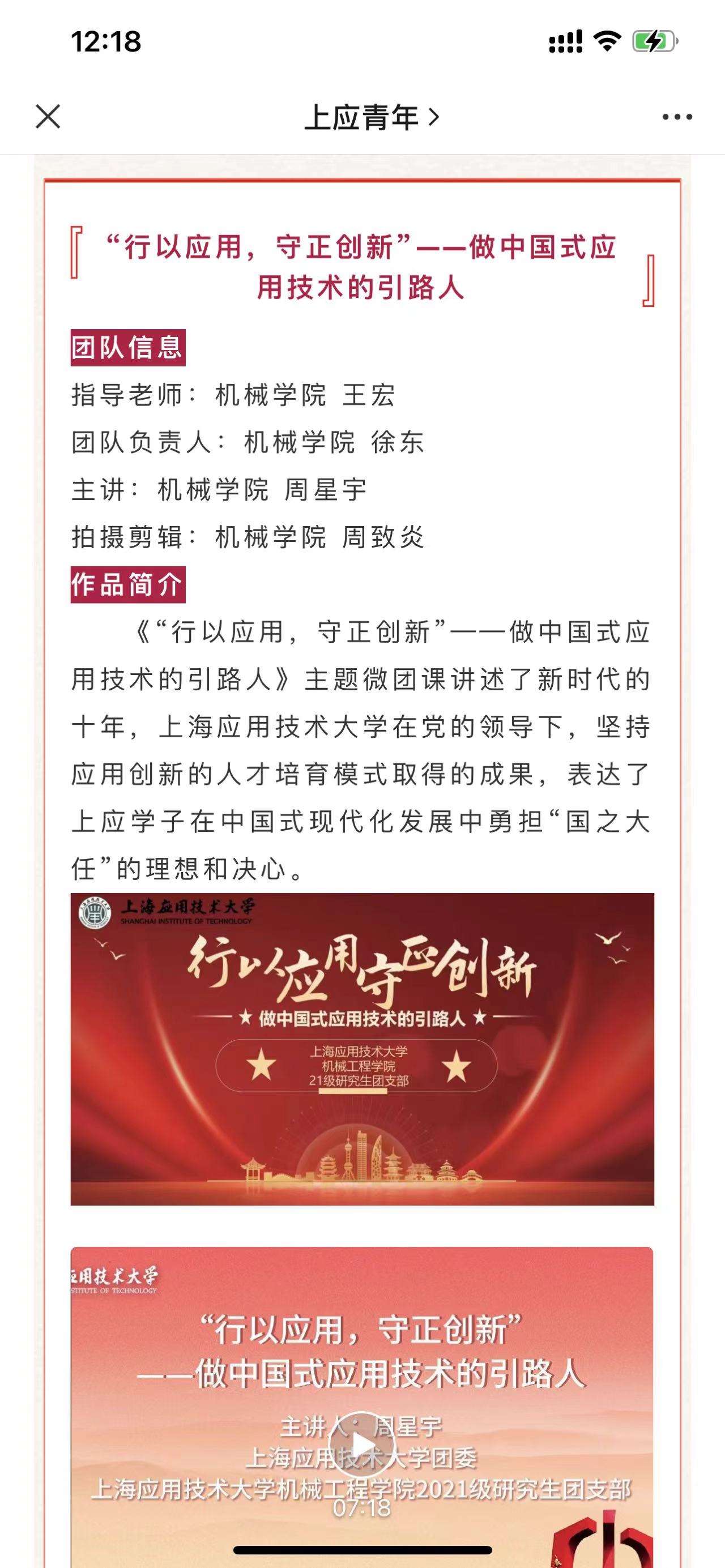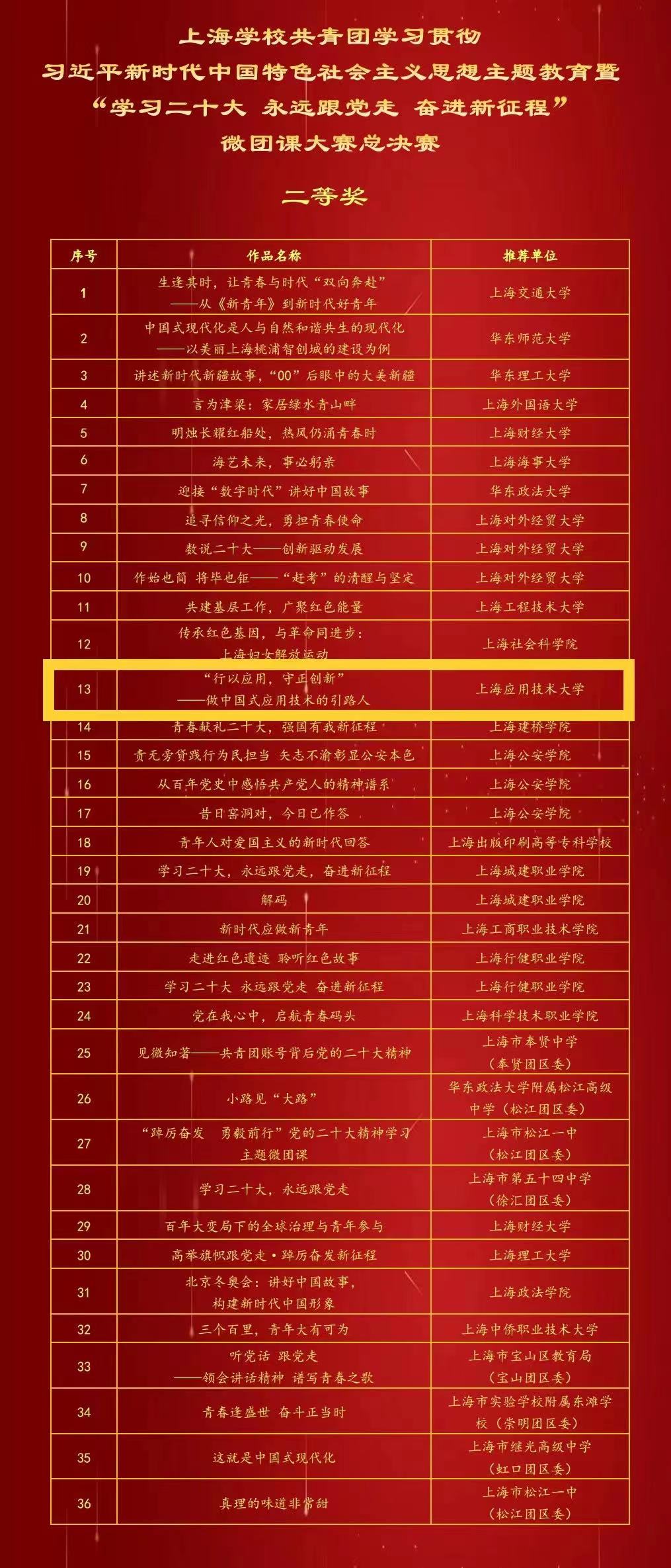 近日,由共青团上海市委员会、上海市学生联合会主办的上海学校共青团学习贯彻习近平新时代中国特色社会主义思想主题教育暨“学习二十大 永远跟党走 奋进新征程”微团课大赛总决赛在华东师范大学举行。我院申报的“行以应用,守正创新”--做中国式应用技术的引路人作品入围决赛,在决赛中该作品收获评委青睐,荣获决赛二等奖。
