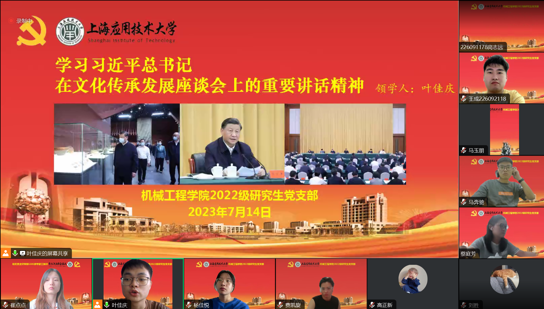 为深入学习贯彻习近平新时代中国特色社会主义思想主题教育,学习习近平总书记在文化传承发展座谈会上的重要讲话精神,进一步增强文化自信,推动党员在文化建设领域发挥先锋模范作用,于7月14日下午,机械工程学院2022级研究生党支部召开了线上学习交流会议。会议由支部副书记叶佳庆主持,内容包括学习习近平总书记在文化传承发展座谈会上的重要讲话精神,围绕“坚定文化自信、建设文化强国”主题进行交流讨论,最后统一观看《自信中国说》视频资料。