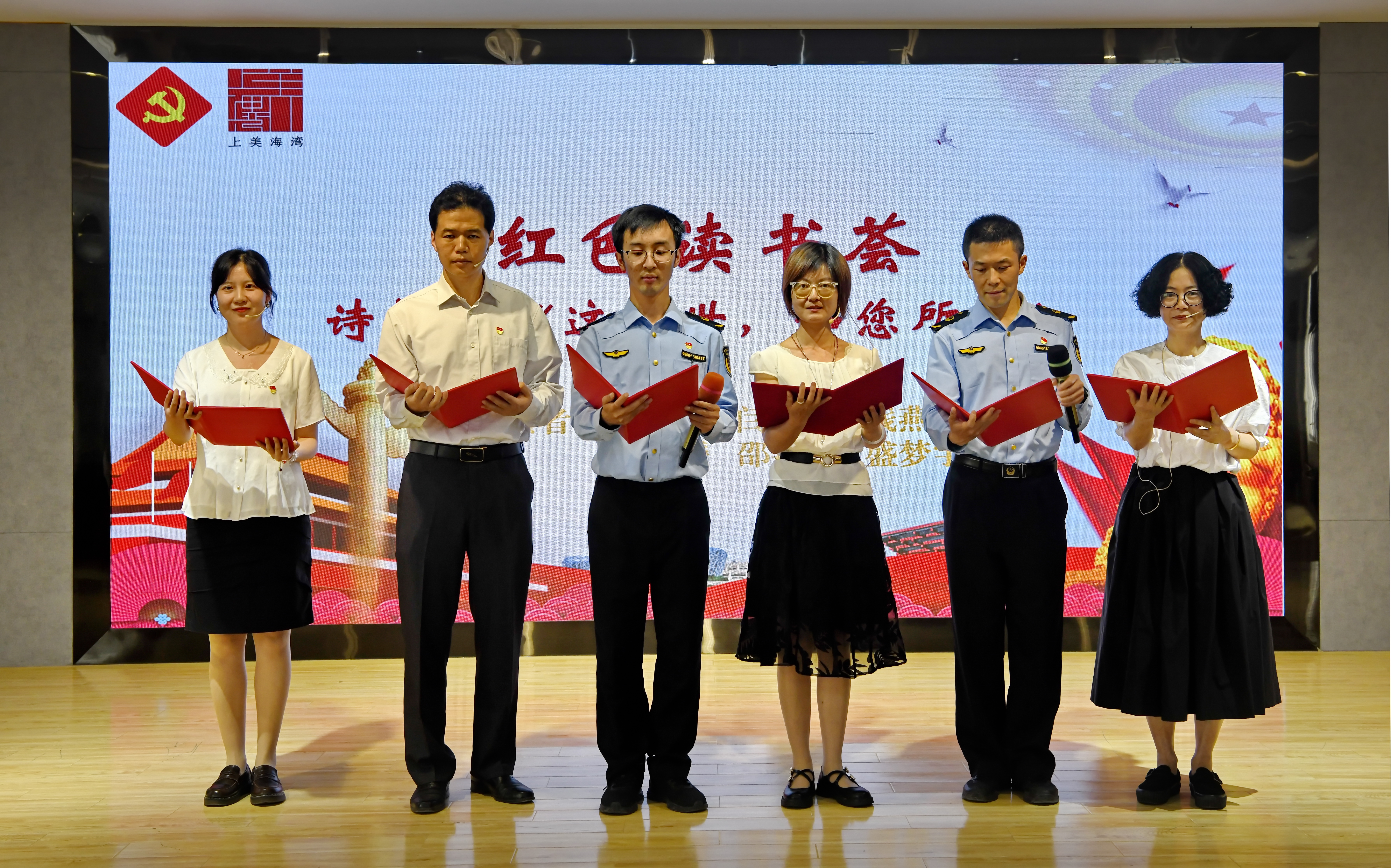 在联学交流环节,首先,教工第四党支部书记龚德利、海湾旅游区市监所党支部书记高扬、海湾旅游区海墅社区党支部书记陈伟分别结合自身工作对《习近平新时代中国特色社会主义思想专题摘编》进行了导读。其次,由党员代表庄晓英、闫奎、钱燕华、赵李媛、邵颖波和盛梦宇带来诗朗诵《这盛世,如您所愿》,展现了如今祖国的强大,让在场的人为今天能生活在如此的太平盛世而骄傲自豪。