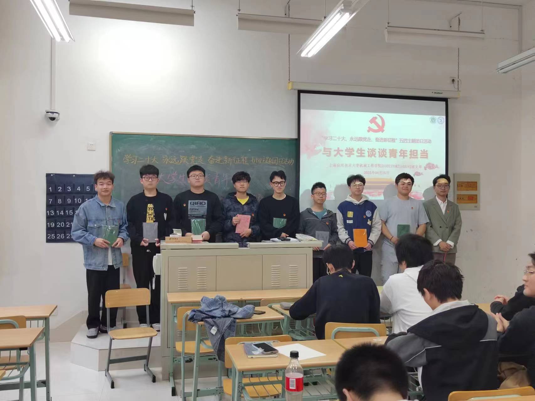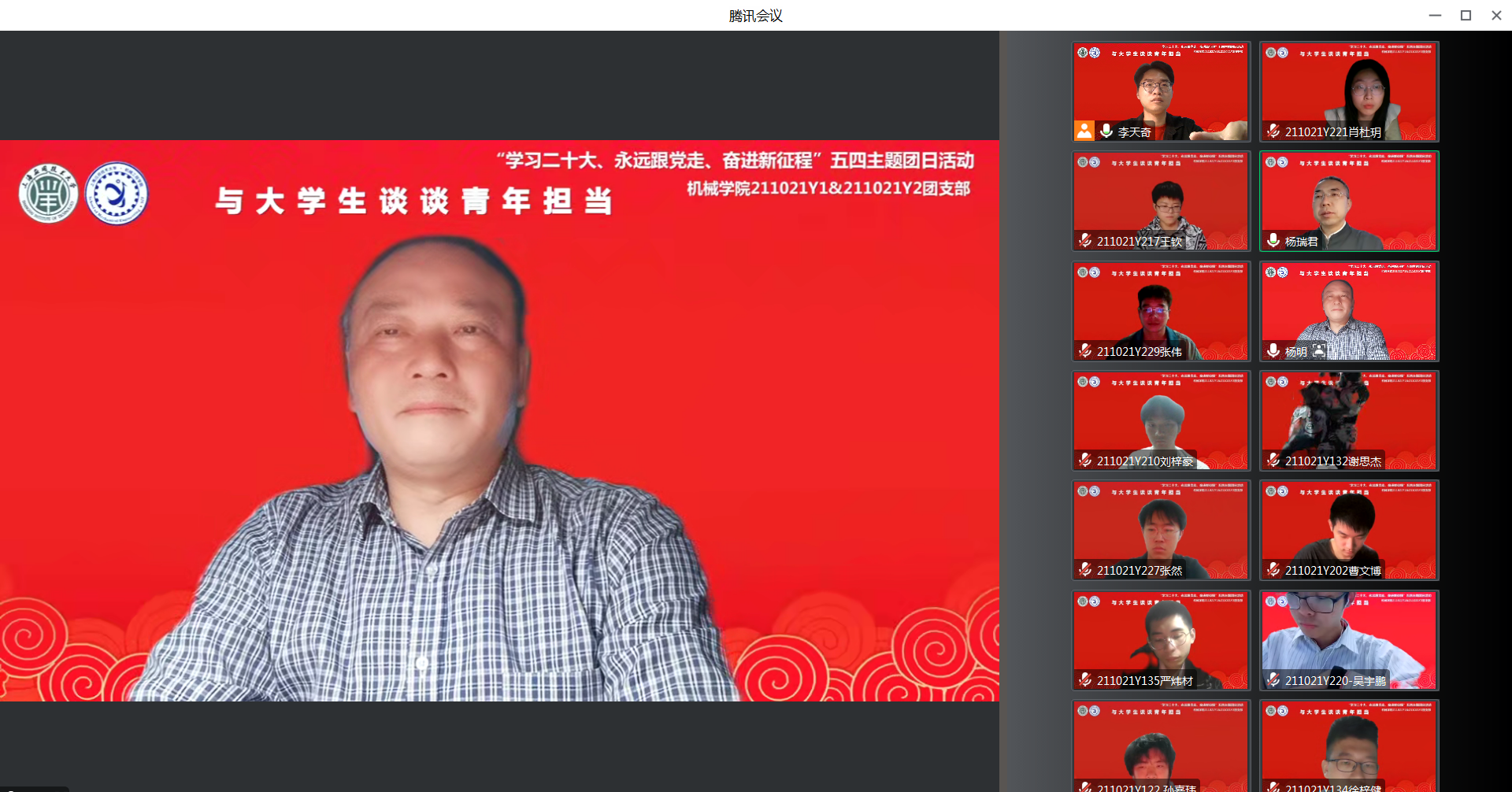 喜迎五四青年节到来之际,为号召青年团员传承五四精神、弘扬五四精神,4月27日上海应用技术大学校党委常委、宣传部部长杨明出席机械工程学院211021Y1 & 211021Y2班团日活动,机械工程学院党委书记杨瑞君、机械工程学院团委书记李天奇、211021Y1 & 211021Y2团支部所有青年团员出席参加。