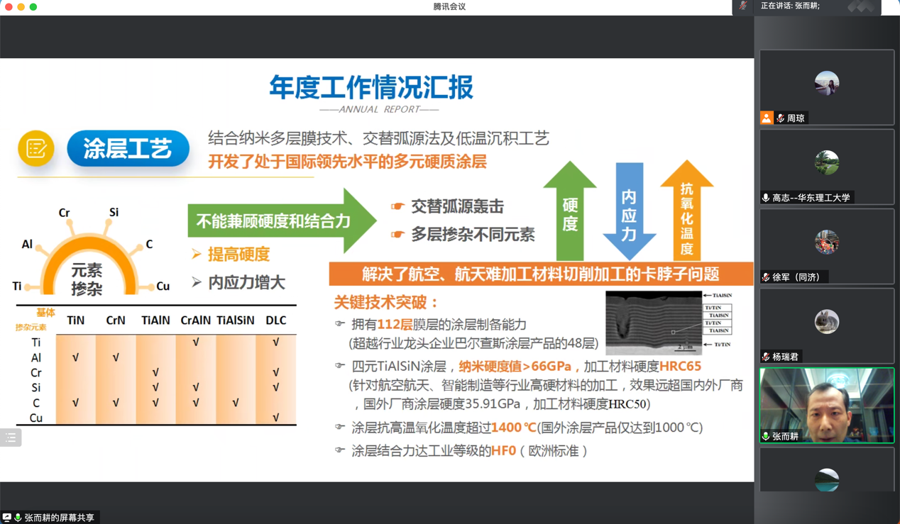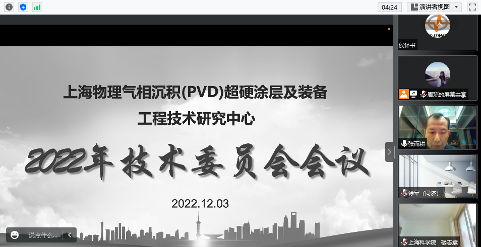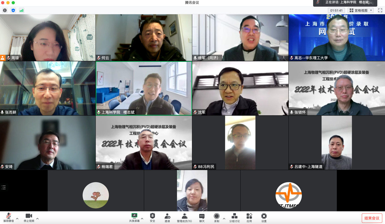 12月3日,上海物理气相沉积(PVD)超硬涂层及装备工程技术研究中心技术委员会会议通过线上会议举行。工程中心主任张锁怀教授主持并致辞。同济大学徐军教授,深圳大学沈军教授,华东理工大学安琦教授,华东理工大学何云教授,上海科学院楼志斌教授,华东理工大学高志教授,上海盾构设计试验研究中心有限公司吕建中教授,上海新弧源涂层技术有限公司冯利民总经理等技术委员会专家应邀参会。学科办副主任刘振江教授,机械工程学院杨瑞君书记,工程中心常务副主任张而耕教授,工程中心侯怀书教授等参加会议。