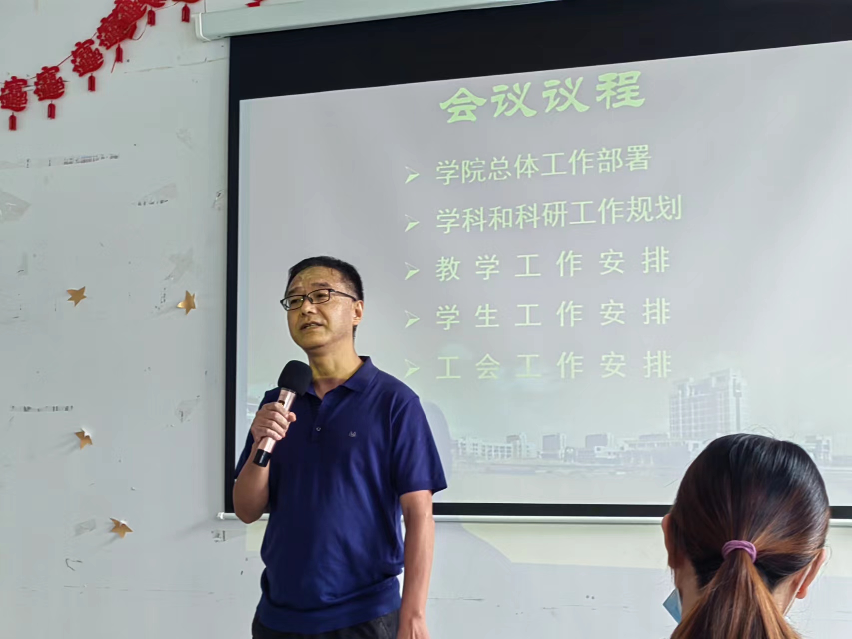 张珂副院长在讲话中指出:疫情下,学院科学研究和学科建设面临挑战、机遇。教师要紧抓实验室安全建设,积极推进科研成果产业化,开拓校企合作新模式;教师要着力培养高质量研究,紧抓研究生教育教学工作。郑刚副院长部署了本学期本科教学工作:明确指出教学材料归档要规范化和制度化,鼓励教师多方努力积极保障疫情延误的毕业设计的归档工作,及时反馈改进相关问题;他要求各专业负责人能严格审定教学过程,严肃教学秩序;鼓励教师多开展教学研讨活动,做好教研并参加教学竞赛;同时积极筹备,全力迎接工程教育认证。会上,副书记、副院长宣蒙蒙重点强调了要全面推进2023届学生就业和新生教育引导工作,鼓励专任教师积极参与到大学生创新的申报工作中来。最后,工会主席就双代会的改选筹备工作进行了详细部署。