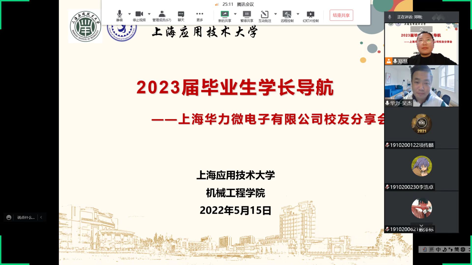 2022年5月15日18点,机械工程学院通过腾讯会议方式开展了优秀校友经验交流分享会。本次会议由机械工程学院辅导员郑慧老师主持,机械工程学院副院长郑刚老师,上海华力微电子有限公司吴杰经理,上海华力微电子有限公司4位优秀校友,以及机械工程学院19级本科生近百人参加本次分享会。