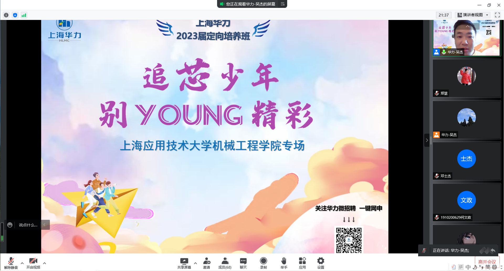2022年5月21日14:00时,机械工程学院通过腾讯会议的方式召开了上海华力微电子宣讲会。上海华力人力资源部专员吴杰、杨爱萍等组成的4人招聘团通过线上的方式进行宣讲招聘,机械工程学院副院长郑刚、机械工程学院辅导员郑慧,邓士杰,以及机械工程学院近百位本科生参加本次宣讲会。