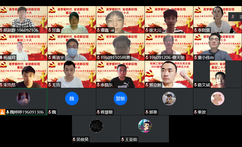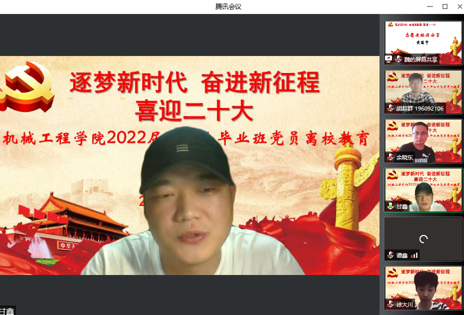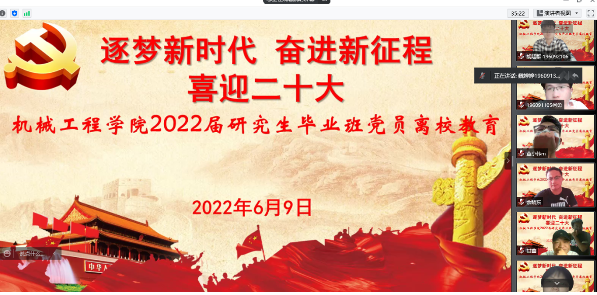 为了引导毕业生党员不忘初心、牢记使命,不断增强“四个意识”、坚定“四个自信”、做到“两个维护”,在毕业生中发挥先锋模范作用。6月9日,机械工程学院通过腾讯会议,线上开展了主题为“逐梦新时代奋进新征程喜迎二十大”的2022届研究生毕业班党员离校教育活动。机械工程学院党委书记杨瑞君、研究生毕业班全体党员参加了此次活动。