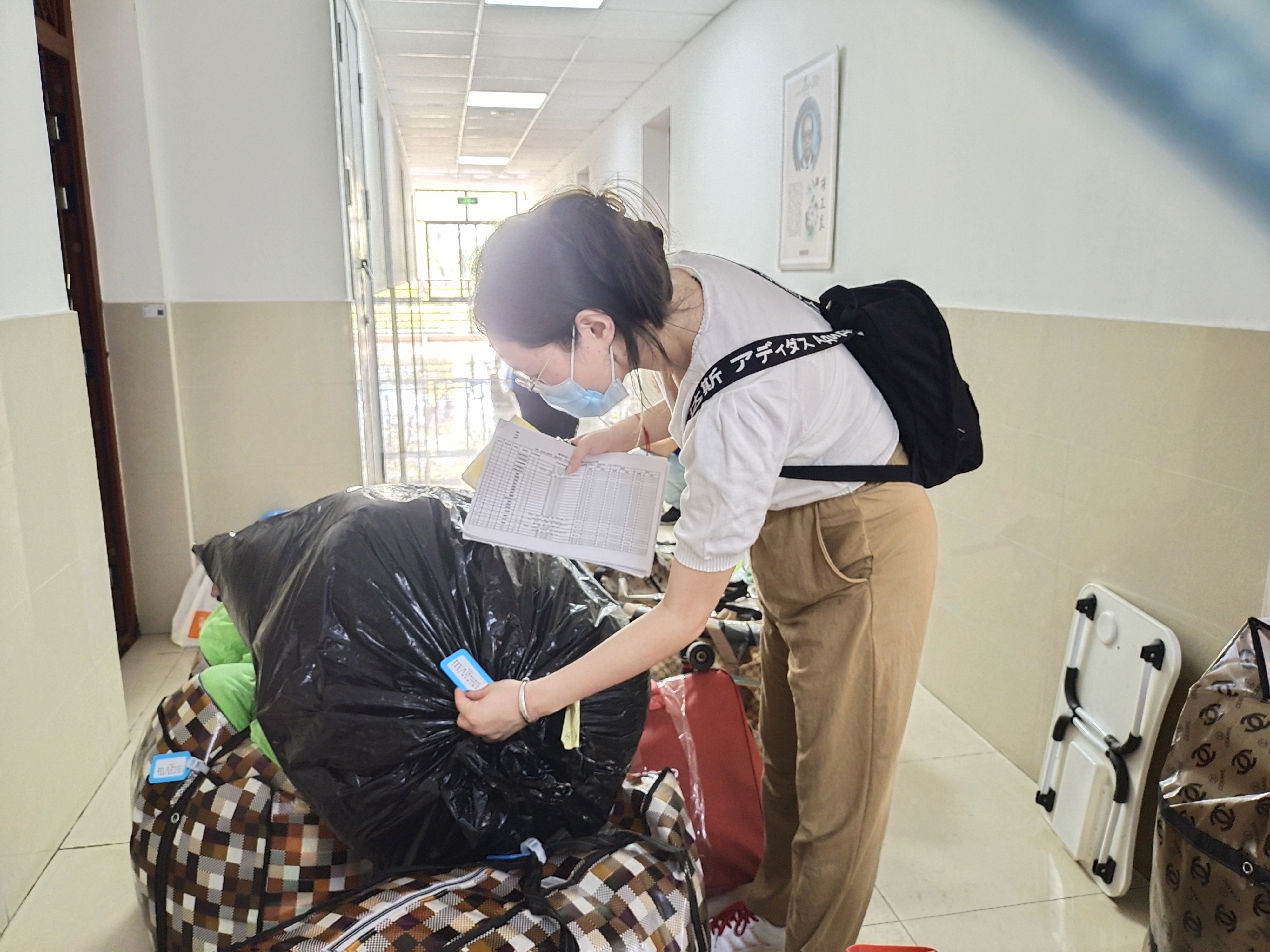 7月9日上午11点至下午5点,学院副书记、副院长宣蒙蒙带队,按照辅导员现场清点、过程押运、行李中转点接收的全程性行李搬运方案,在搬运工人的全力配合下,完成了30个宿舍613件行李的搬运工作,并于7月10日6点至11点,完成了剩余425件行李的搬运工作。