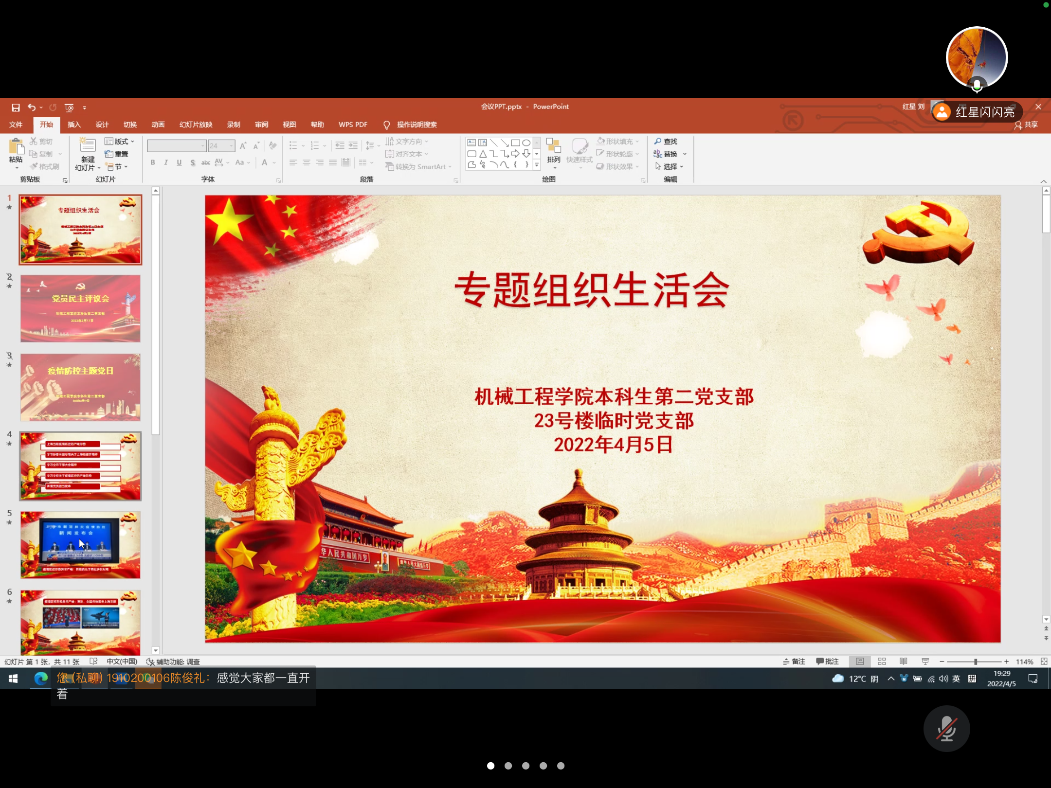 2022年4月5日机械工程学院本科生第二党支部和23号楼临时党支部召开学习疫情防控精神专题组织生活会。会议由党支部书记刘红星主持,机械工程学院党委副书记、副院长宣蒙蒙参加会议,机械工程学院本科生第二党支部全体党员、23号楼临时党支部党员、入党积极分子和团员志愿者共计60余人参加线上专题组织生活会。