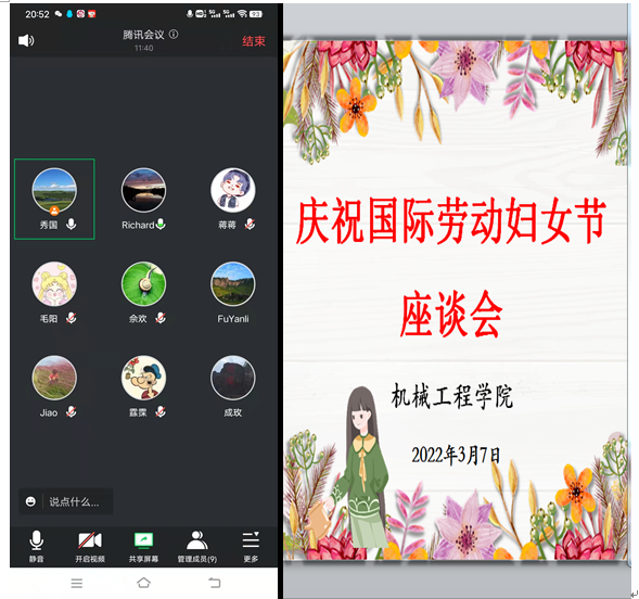 3月7日晚,为了迎接国际妇女节,致敬女教师职工,机械学院领导班子、工会组织召开座谈会,以线上、线下参会的方式,邀请校内13位女教师在内的20余位机械女教职工参加。会上,杨瑞君书记首先做了简要讲话,向与会的女职工表达了三八妇女节的良好祝愿,感谢她们为学院所做的贡献。随后,工会主席沈秀国,副书记副院长宣蒙蒙、副院长张珂、郑刚,纷纷提出殷切希望和美好祝愿。随后大家畅所欲言,校外的每一位教师都对留校的女教职工送上祝福、亲切关怀,希望一切安好,共克时艰保重身体,早日回家团聚。