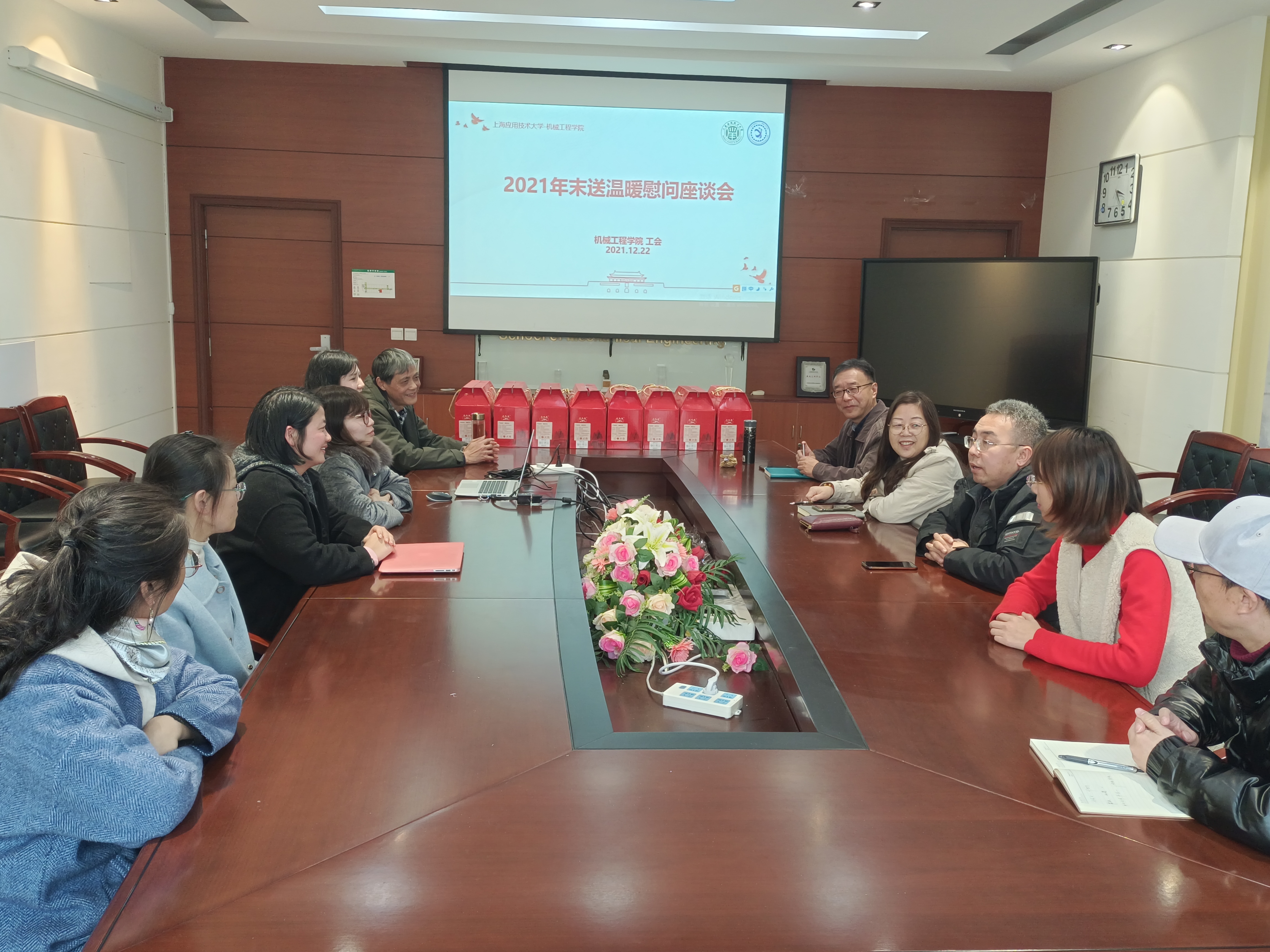 12月24日,机械工程学院在第一学科楼A324组织召开座谈会,对2021年度有特殊贡献、工会积极分子以及家庭困难的教职工送温暖慰问,学院领导班子成员出席会议,会议由工会主席沈秀国主持。