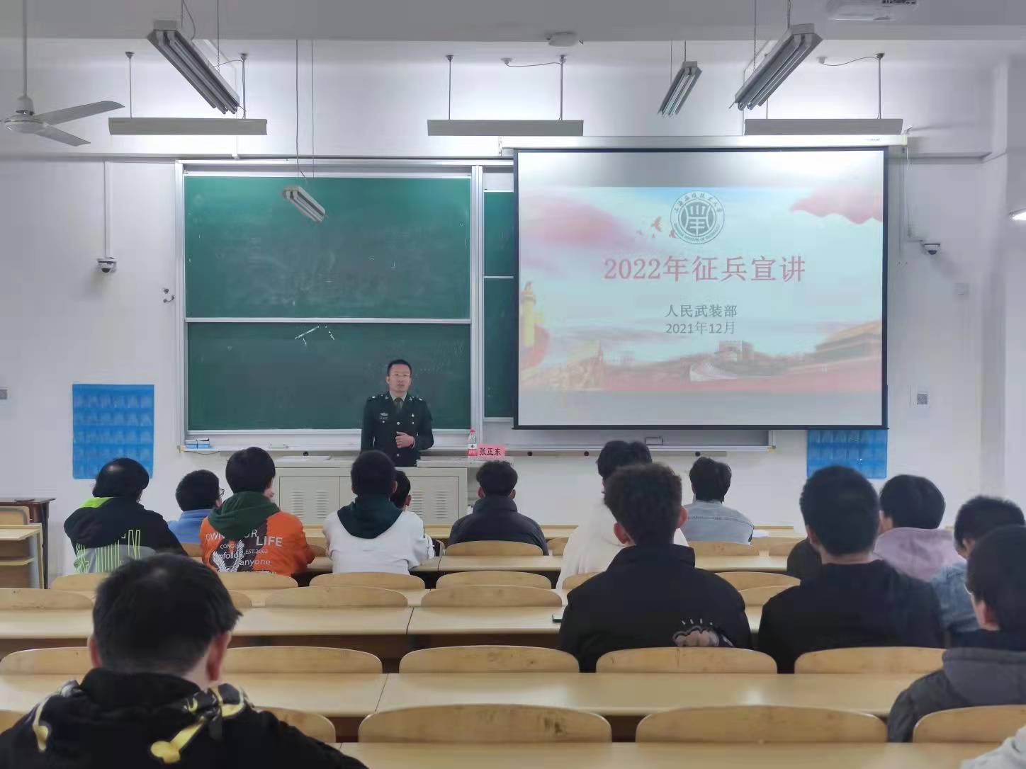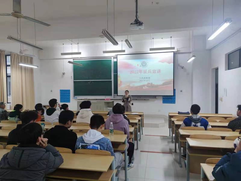 为宣传国家征兵政策,进一步做好我院2022年征兵工作,鼓励学生积极响应国家号召,投身军营,报效祖国。机械工程学院邀请了我校人民武装部张正东老师及征兵宣讲团成员,12月12日下午13:30,在二教G201召开2022年征兵工作宣讲会,我院百余名在校学生、退伍学生、以及辅导员参加了本次宣讲会。