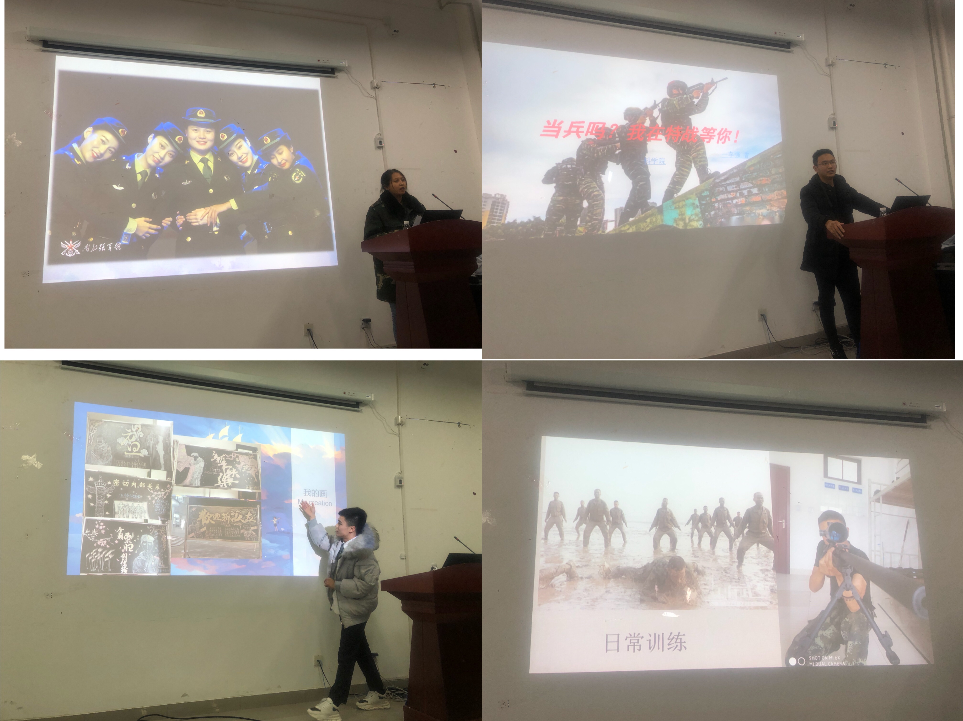 在军旅生涯交流分享环节中,郑爽、张士博、李强三位退伍同学与参会同学分别分享自己的军旅生活。郑爽之前服役于中国人民解放军火箭军部队,她说:“青春有很多样子,很庆幸我的青春有穿军装的样子”。巾帼不让须眉,在部队的她艰苦训练,在2019年度荣获得了“优秀义务兵”。来自中国人民武装警察部队的张士博同学,他向同学们分享了在部队学到的诸多技能,并感恩部队真正地帮助他,让他今后成长成才。最后一名退伍学生---李强,曾经服役于中国人民武警部队特战部队,作为特战队员,他参加了六次魔鬼周训练,并先后获得了四届“极限勇士”,“优秀义务兵”“上海中国器考核第一名”。三年的军旅生活,让他们抛开年少稚嫩,成长了许多。