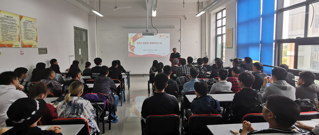 开班典礼一开始全体成员起立唱国歌,马轻轻主持开班典礼并宣读了党课纪律和考核要求。学院党委书记杨瑞君结合“四史”学习教育和疫情常态防控与学院事业推进发展中的党建引领,作了题为《端正入党动机,争取早日入党》的主旨报告。他主要从“初心”和动机的关系、入党动机的类型(理想型动机、积极进取型动机、虚荣型动机、实用型动机)、从三个方面分析如何端正入党动机、“为什么要入党”和“入党后怎么做”五个方面展开。他从革命前辈到战疫党员,用生动的事例给学员们诠释了什么是正确的入党动机,指出每个人都要找到并明确自己的入党动机,以及明白自己的初心。并提出要求:希望积极分子能够严格按照党校的各项要求积极认真完成所有培训内容,并能将所学与自己的学习生活和学生工作相结合,学有所思,学用结合,学有所成。