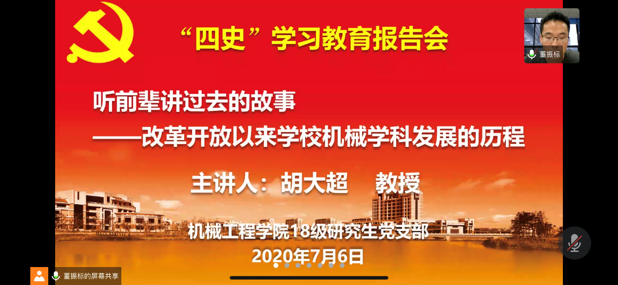 7月6日,18级研究生党支部邀请了机械工程学院胡大超教授,开展了主题为“听前辈讲过去的故事——改革开放以来学校机械学科发展的历程”的“四史”学习教育讲座。机械学院党委书记杨瑞君、副院长何静、组织员马轻轻、研究生支部书记董振标,程道来、张而耕教授等17名教师和18级研究生党支部全体党员、入党积极分子参加了会议。