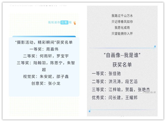 “心理微视频大赛”旨在积极构建网络微平台,畅通防疫渠道,增强战胜疫情的决心和信心。通过学生记录身边真实发生的故事、行为、经历和感想,以此为基础制作心情故事微视频,丰富心理健康教育手段和方法,激发学生兴趣,切实将防疫与心理教育相结合,促进学生心理向积极健康方向发展。“精彩瞬间摄影大赛”和“自画像--我是谁”活动旨在通过作品征集,让同学们缓解疫情压力,配备好心理“防护服”,提升学生心理免疫力,同时展现理工学子的良好精神风貌,活跃校园人文气息,促进同学们之间的交流。