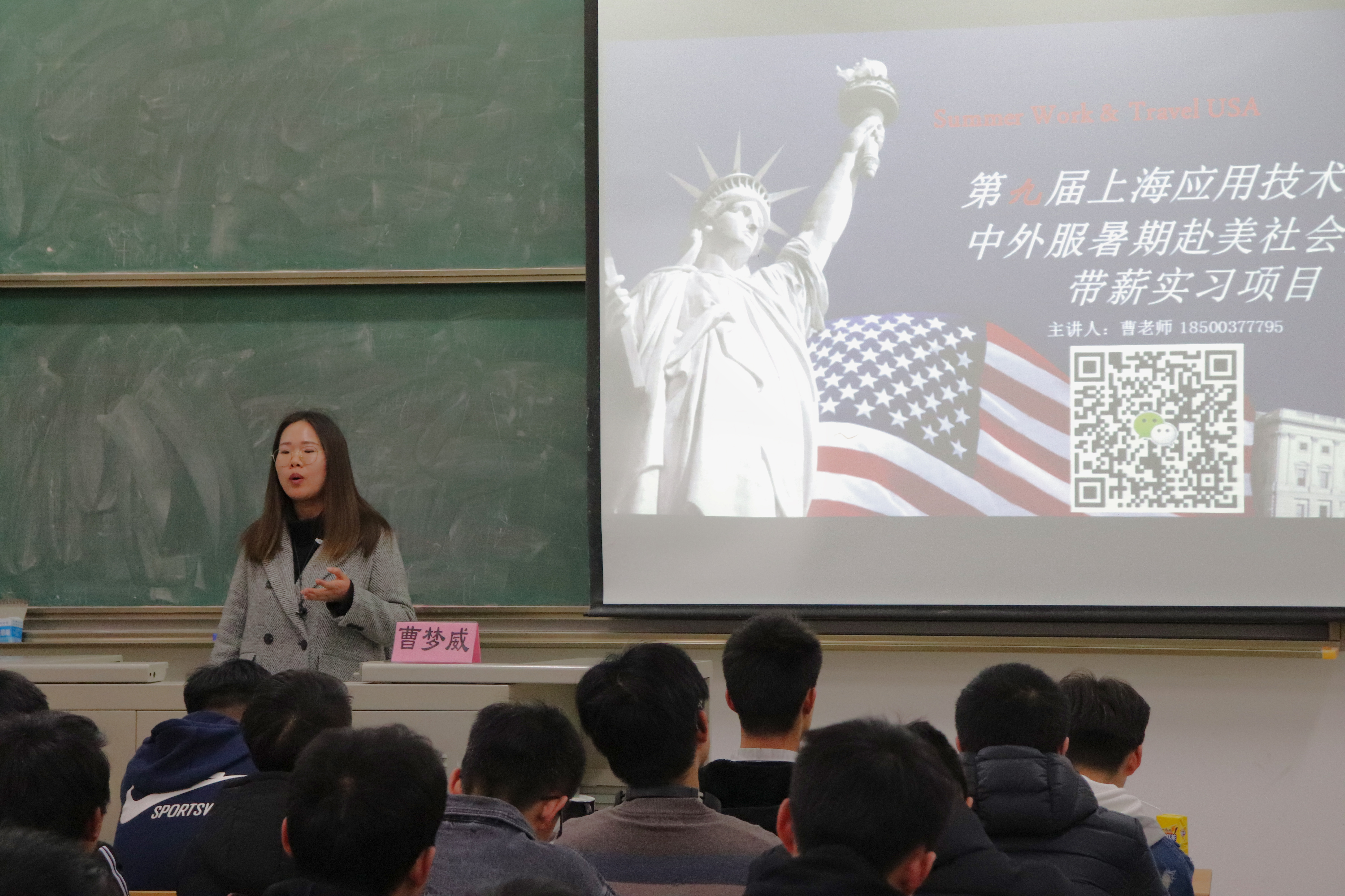 本次讲座详细介绍了赴美带薪实习项目前期准备的细节、签证办理,口语测试、实习地点、实习岗位、参加条件、实习薪资以及对于学生工作能力的培养等几个方面。曹老师强调了赴美带薪实习的项目可以帮助学生开阔眼界、加强沟通技巧、增强独立能力、领略不同国家文化,参与该项目的学生在以后的学习工作中具备一定优势。参加过此项目的金燕婷和李田宇同学也分别分享了自己在美国实习项目中的经历以及感悟。