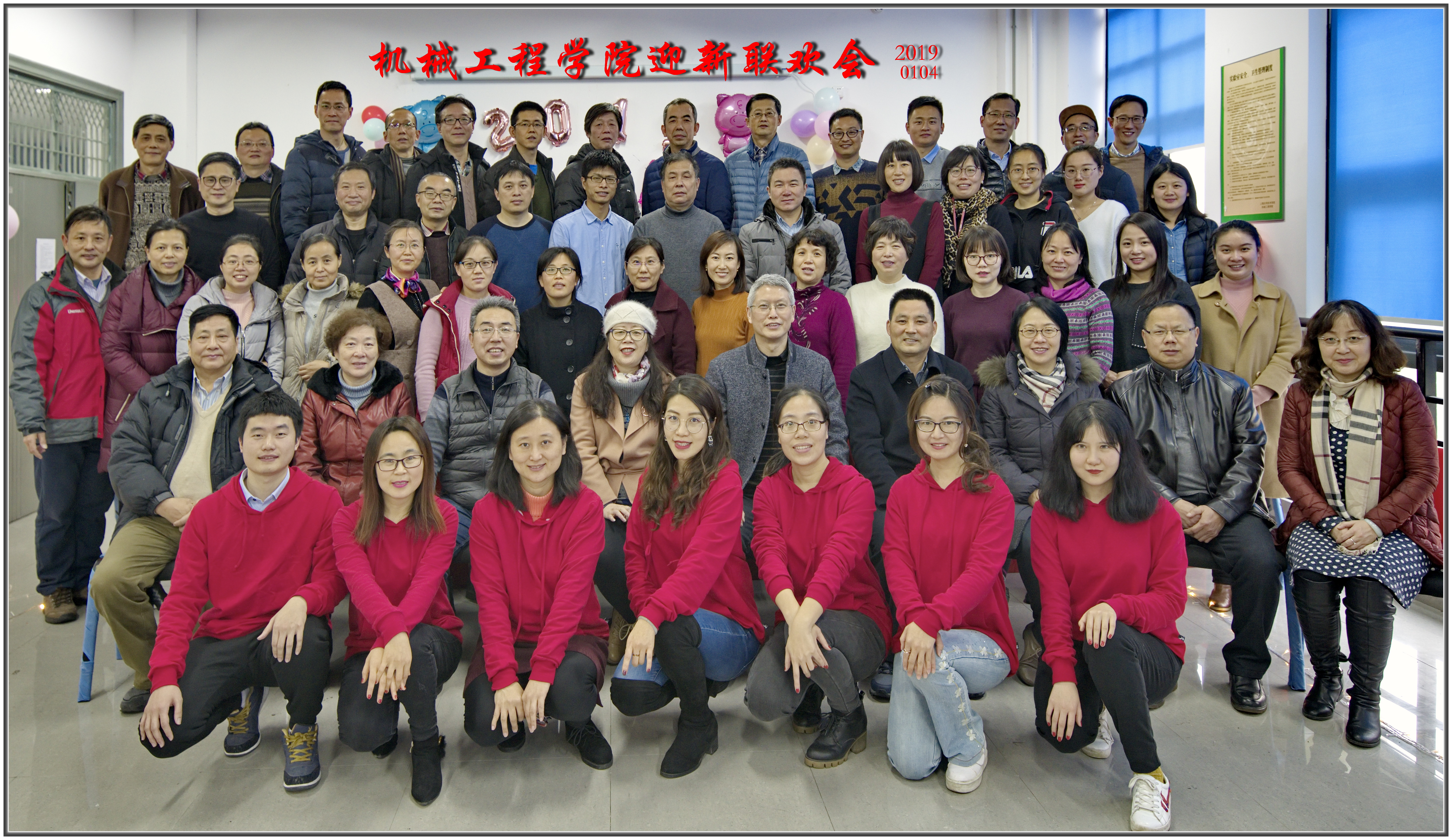 为丰富全院教职工课余文化生活,展示教职工的精神风貌,以崭新的姿态迎接新的一年,机械工程学院于2019年1月4日下午举行了2019年迎新联欢会,莅临现场的有副校长张锁怀,学院班子成员,行政部门领导钟晓勤、程道来、吴斌等,兄弟学院领导张东民、周文、朱柳娟、吴雁等,退休教师代表胡大超、郑竹岚、俞梅等,还有学院的73位教职工,大家欢聚一堂,共迎新年。