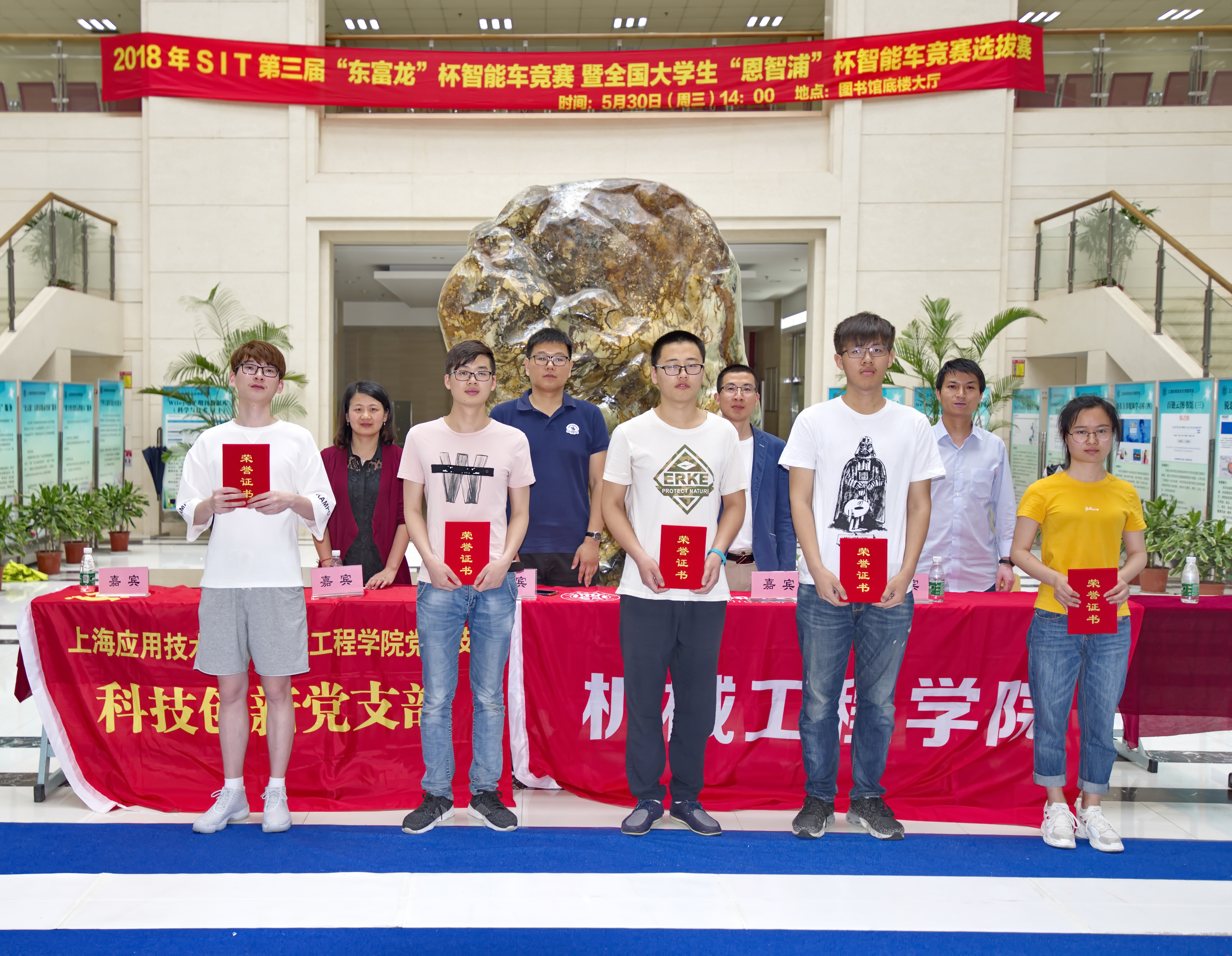 5月30日,第三届“东富龙”杯智能车竞赛校内选拔赛在图书馆底楼成功举行。计算机科学与信息工程学院党总支书记刘胤杰,电气与电子工程学院副院长马向华,学生工作部副部长陈雷,教务处及相关辅导员老师等观摩比赛。学生工作部副部长陈雷老师为获奖同学颁奖。