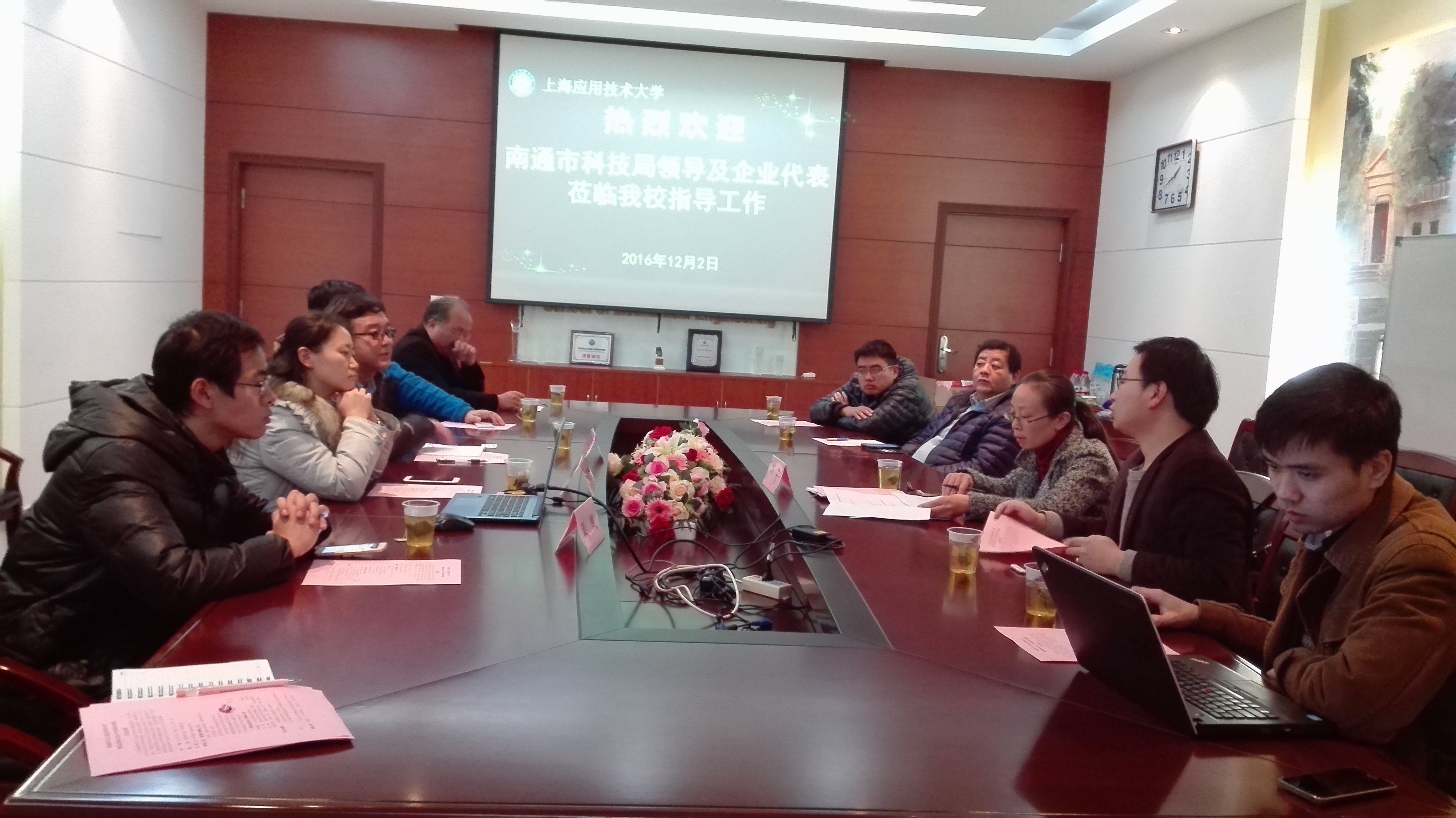 为加强我校与南通市的科技合作,充分发挥我校学科优势,促进科技成果转化,助推南通市企业发展,12月2日在奉贤校区举行“上海应用技术大学与南通市智能装备企业产学研需求对接会”,会议由原科技处副处长单晓茜主持,科技处赵健、机械工程学院科研院长张珂及相关学院的教师代表参加会议。南通市科技局产学研合作处主任刘华,江苏华宇印涂设备集团有限公司、江苏力德尔电子信息技术有限公司、南通爱慕希机械股份有限公司等企业领导参加对接会。双方就“智能装备企业产学研需求”进行会谈交流,并就产学研需求合作意向进行深入探讨。刘华一行还参观了机械学院的实验室和生态学院的植物园。