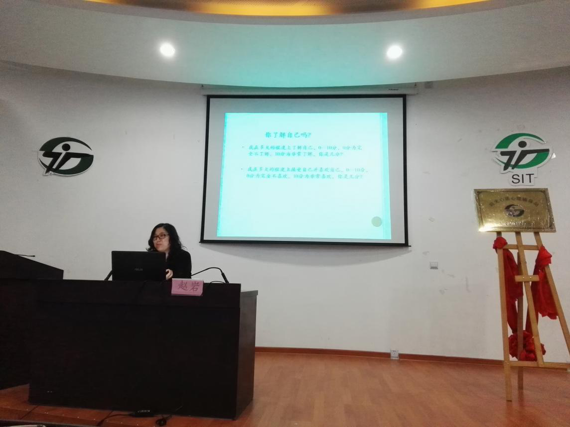 讲座环节,赵岩老师以“认识自我,完善自我--大学生塑造积极自我的方法”为主题,从“何为自我”、“自我的发生发展”、“大学生自我的发展矛盾和偏差”及“积极塑造自我的途径和方法”四方面展开讲述。期间赵老师和大家分享了大量心理健康教育案例和视频。讲座现场热情洋溢,充满激情,讲授过程中同学与老师积极互动,探讨生活中所遇到的问题,更是将自己的所见所闻,所感所想与老师进行交流。此次讲座对大学生的心理健康方面起到了积极的指导作用,使同学能更好的认识自己,同学们都表示受益颇深。