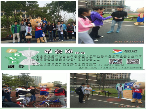 10月27日,机械工程学院易班分站与机械工程学院学生会,在上海应用技术学院易班站的指导下,在学校二食堂的大力支持下,以学校东操场、滴水湖广场为主要活动阵地,为参加晨跑的学生以及参加校团委举办的晨读活动的学生免费发放爱心早餐卷。本次活动发放了两百多张爱心早餐卷,工作人员在发放餐卷的过程中,宣传了学校易班;同时,鼓励晨读的学生继续坚持晨读晨跑,以“星星之火可以燎原”的行动心态鼓励更多的学生参与其中,做时间的主人,践行“厚德精技,砥砺知行”的工程师文化内涵,为上海应用技术学院学风建设、校园文化建设贡献力量。