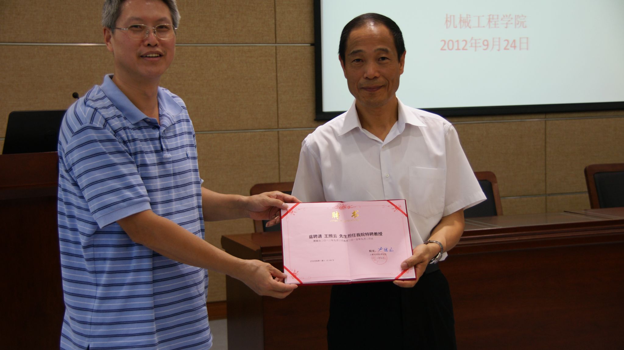 为了提升教育教学水平,提高学生专业认知程度和学习兴趣,增加学生就业率, 9月24日下午,机械工程学院邀请我校特聘教授、上海鼎龙机械有限公司总经理王照云先生,在图书馆B101举行了一场以“专业素质培养与大学生生涯规划”为主题的讲座,学院2011级和2012级学生生聆听了讲座。机械工程学院院长张锁怀、学校研究生部副主任张东民出席了此次活动,张锁怀院长代表学校为王照云先生颁发了“特聘教授”荣誉证书。