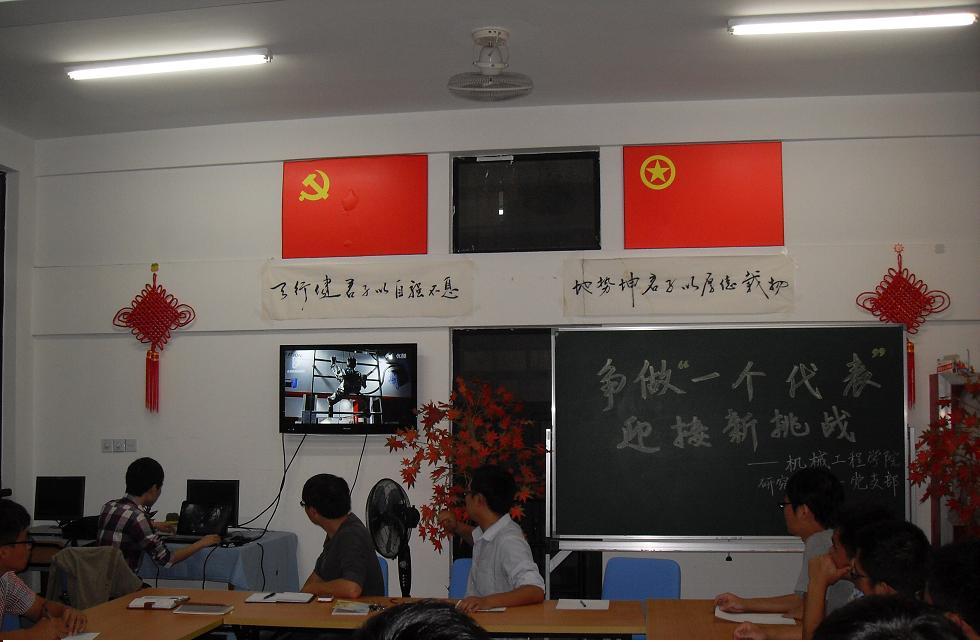 研究生生活,新起点,新开始,在这个新的环境和组织中,为引导班级同学思考:如何更快的适应新生活?如何更好的继承和发扬党的优良传统,践行“先进文化代表”的基本要求?如何结合研究生自身的特点推进科学技术文化繁荣发展?机械工程学院研究生第一党支部召开了“争做‘一个代表’,迎接新挑战”组织生活会。